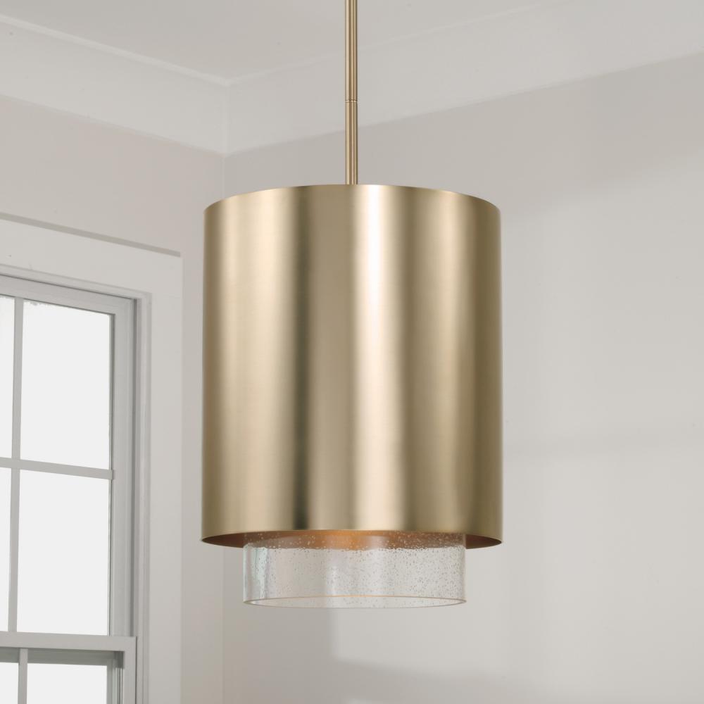 The cylindrical Matte Brass metal shade compliments the seeded glass detail for a sophisticated mix.
