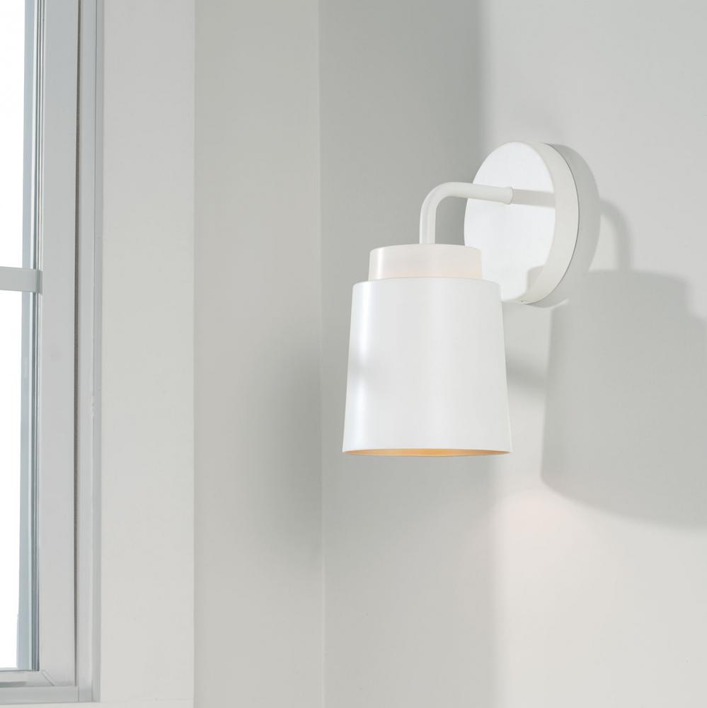 Tapered and concise, the Pratt Sconce brings sophisticated style to task lighting. Finished in Matte White, the tiered metal shade creates a sleek aesthetic, while the inner Soft Gold finish invites intriguing dimension.