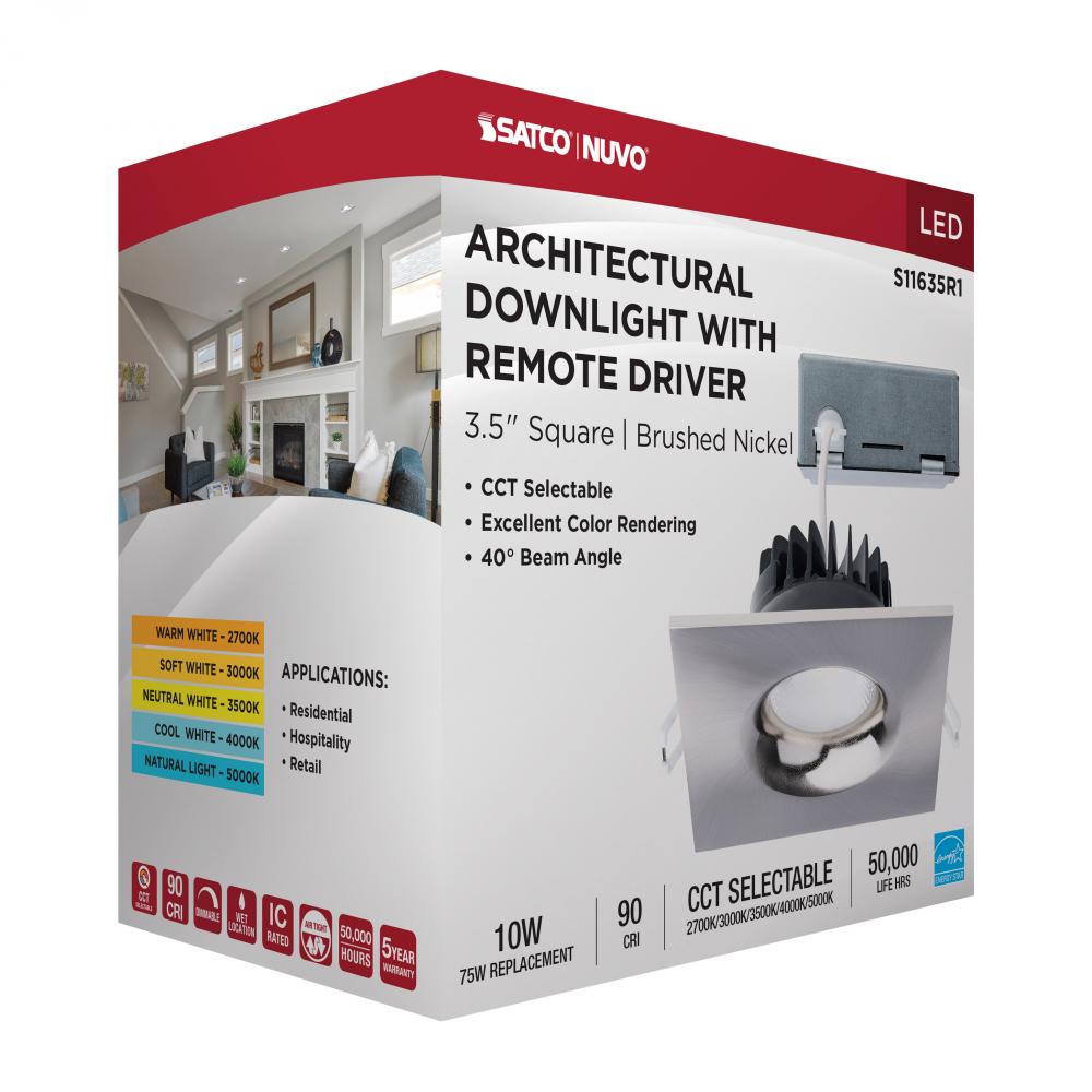 10 Watt LED Direct Wire Downlight; Remote Driver; CCT Selectable; Dimmable; Square; Brushed Nickel