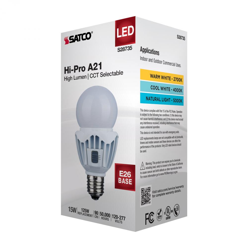 15 Watt LED A21; High Lumen Output; 27K/40K/50K CCT Selectable; Medium Base; White Finish; 120V-277V