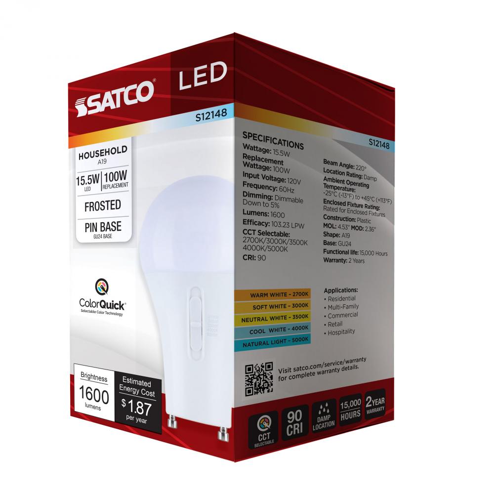Maximize illumination with SATCO NUVO's powerful 15.5-watt LED A19 bulb (S12148), designed to deliver robust performance and efficiency. This GU24 base bulb features 5 CCT selectable technology (2700K–5000K), a high 90 CRI, and a frosted finish for s