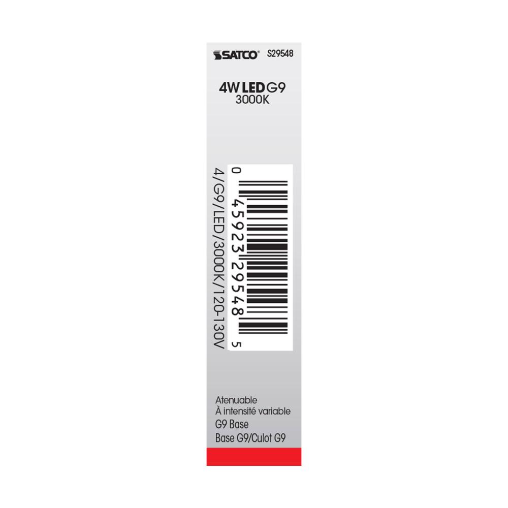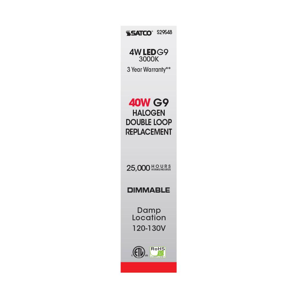 Satco's 4 watt JCD G9 base miniature frost light bulb is shaped to fit into tight spaces without drawing too much energy. The clear, miniature LED bulb features a bi pin G9 base with a 360 degree beam spread. With a temperature of 3000 kelvins, this la