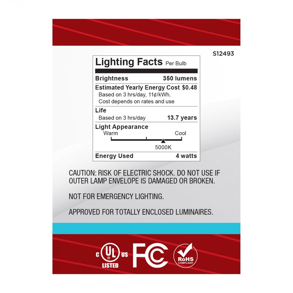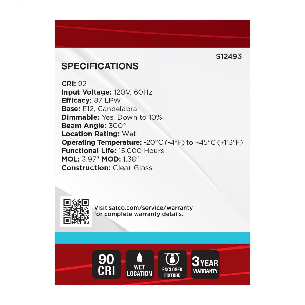 Satco's S12493 4-watt, LED lamp is traditional, yet contemporary with its vintage style and energy saving LED technology. Elegantly illuminate any room in the house with this dimmable, clear bulb. Sophisticated and modern, this lamp delivers 15,000 hou
