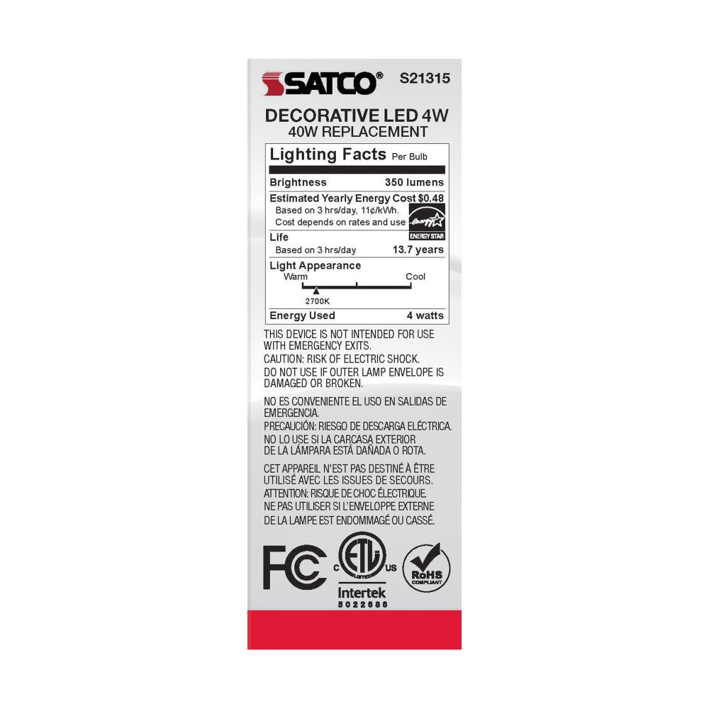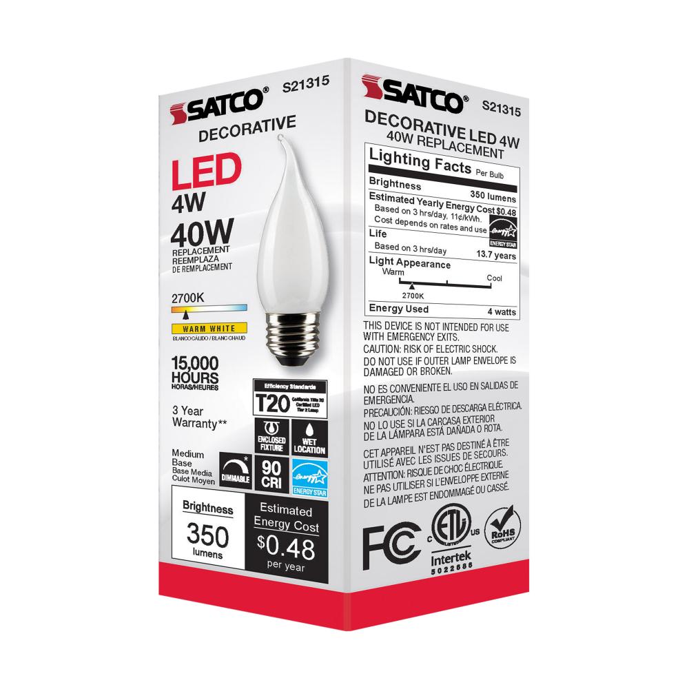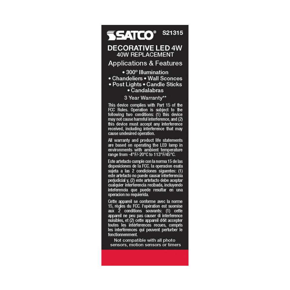 Satco's S21315 4-watt LED lamp is traditional, yet contemporary with its sleek finish and energy saving LED technology. Elegantly illuminate any room in the house with this dimmable, frost finished bulb. Sophisticated and modern, this lamp delivers 15,