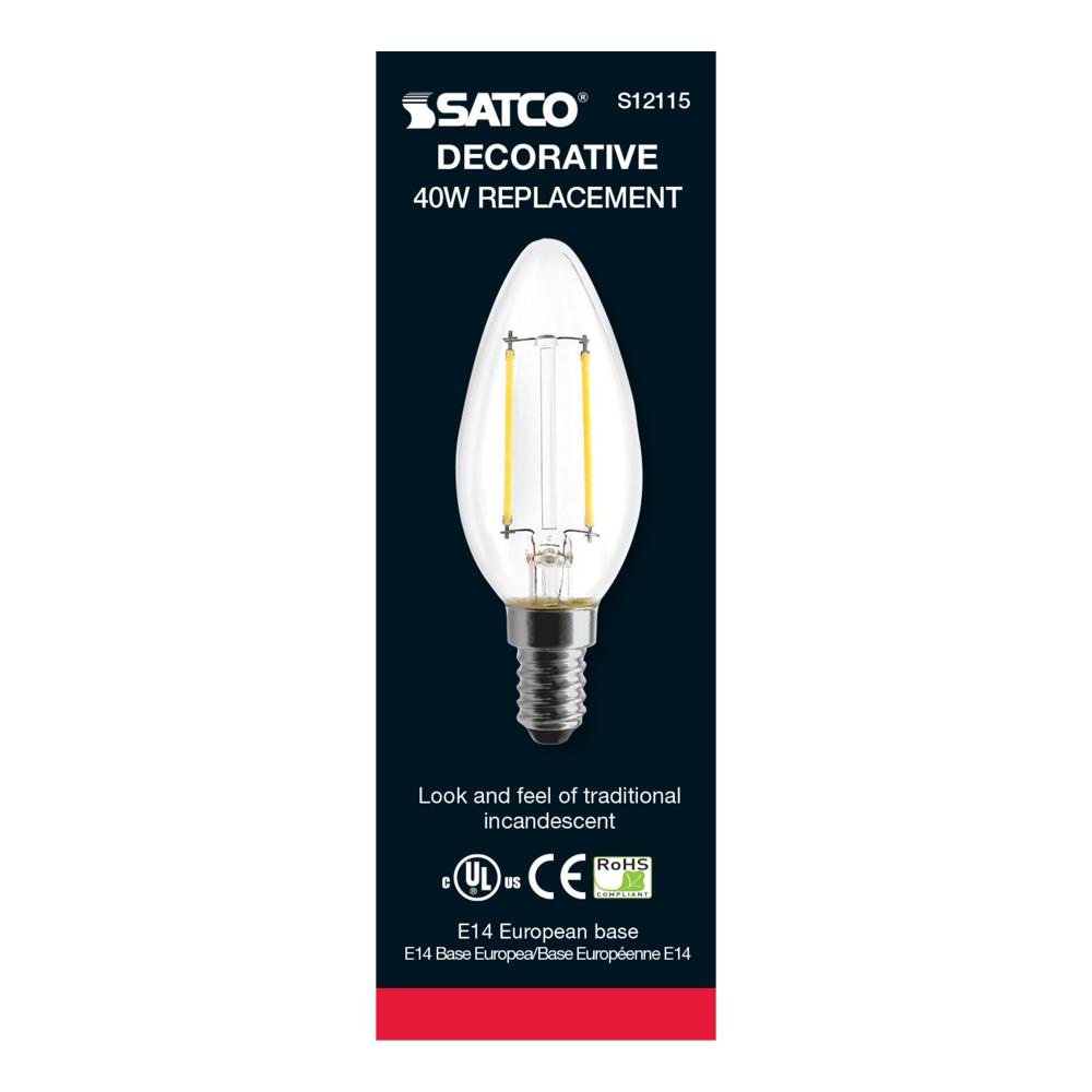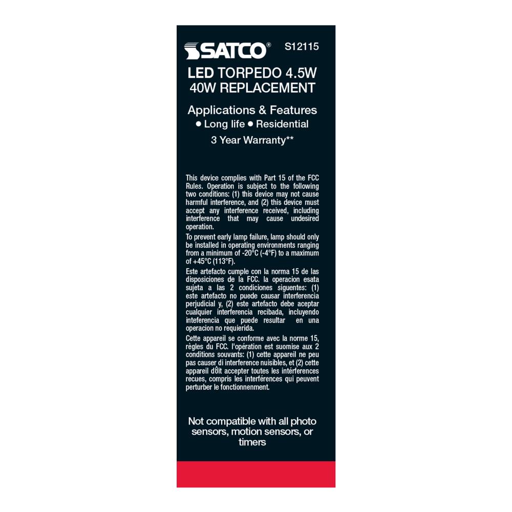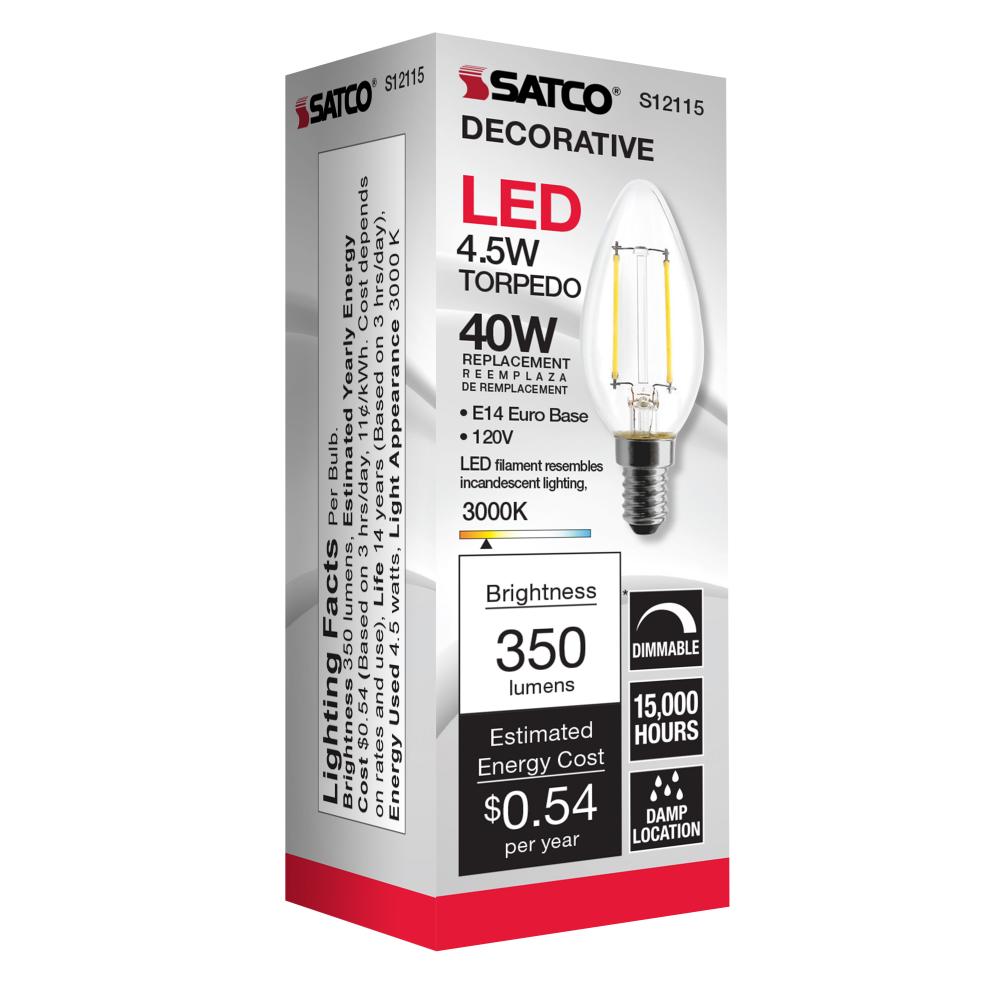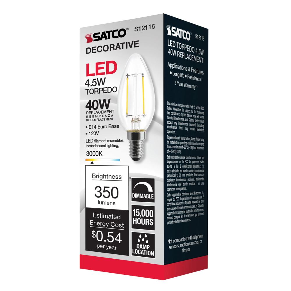 Satco's S12115 is a filament style LED with the look and feel of a traditional incandescent lamp. The torpedo shape lamp has a European E14 base and a color temperature of 3000K. A 4.5-watt LED, but is equivalent to a 40-watt incandescent. Additional f