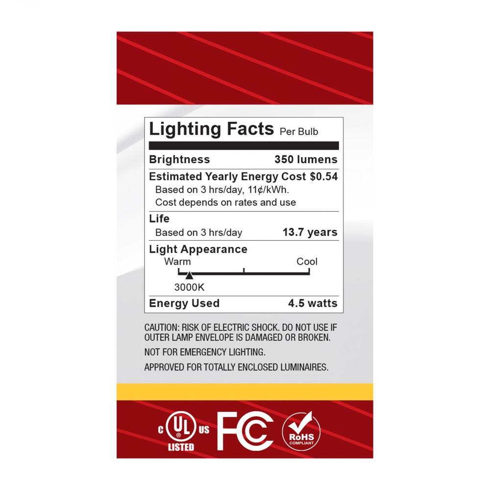 Satco's S12474 4.5-watt LED lamp is traditional, yet contemporary with its sleek finish and energy saving LED technology. Elegantly illuminate any room in the house with this dimmable, globe shaped bulb. Sophisticated and modern, this lamp delivers 15,