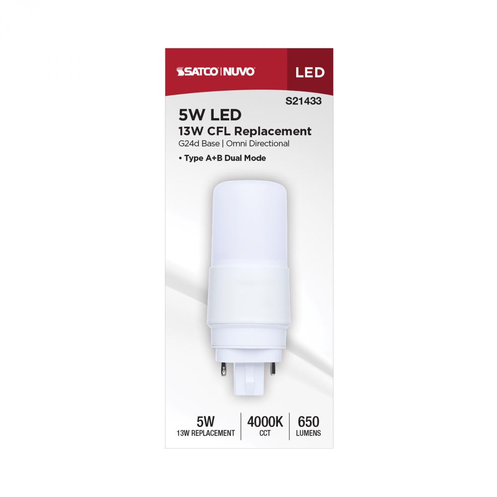 SATCO NUVO's S21433 CFL replacement lamp delivers reliable, energy-efficient performance in a compact and versatile PL shape. This 5-watt model is designed to replace 13-watt CFLs, providing a 4000K cool white light with a G24d base. A+B dual mode ball