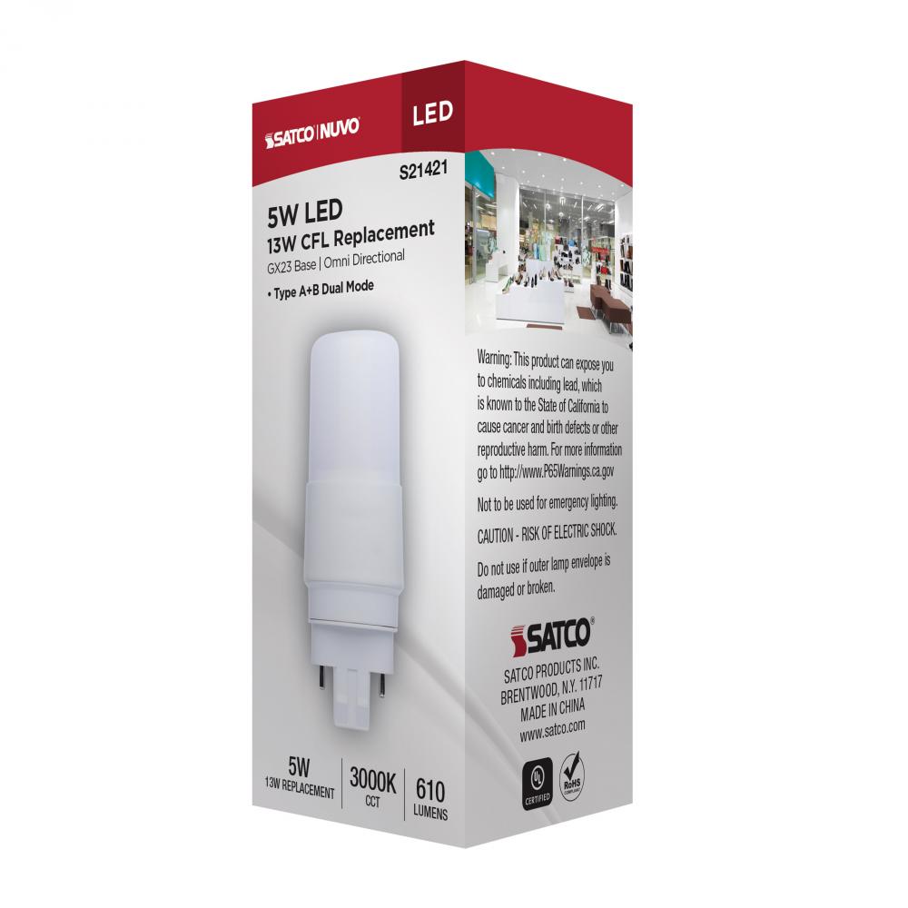 SATCO NUVO's S21421 CFL replacement lamp delivers reliable, energy-efficient performance in a compact and versatile PL shape. This 5-watt model is designed to replace 13-watt CFLs, providing a 3000K warm white light with a GX23 base. A+B dual mode ball