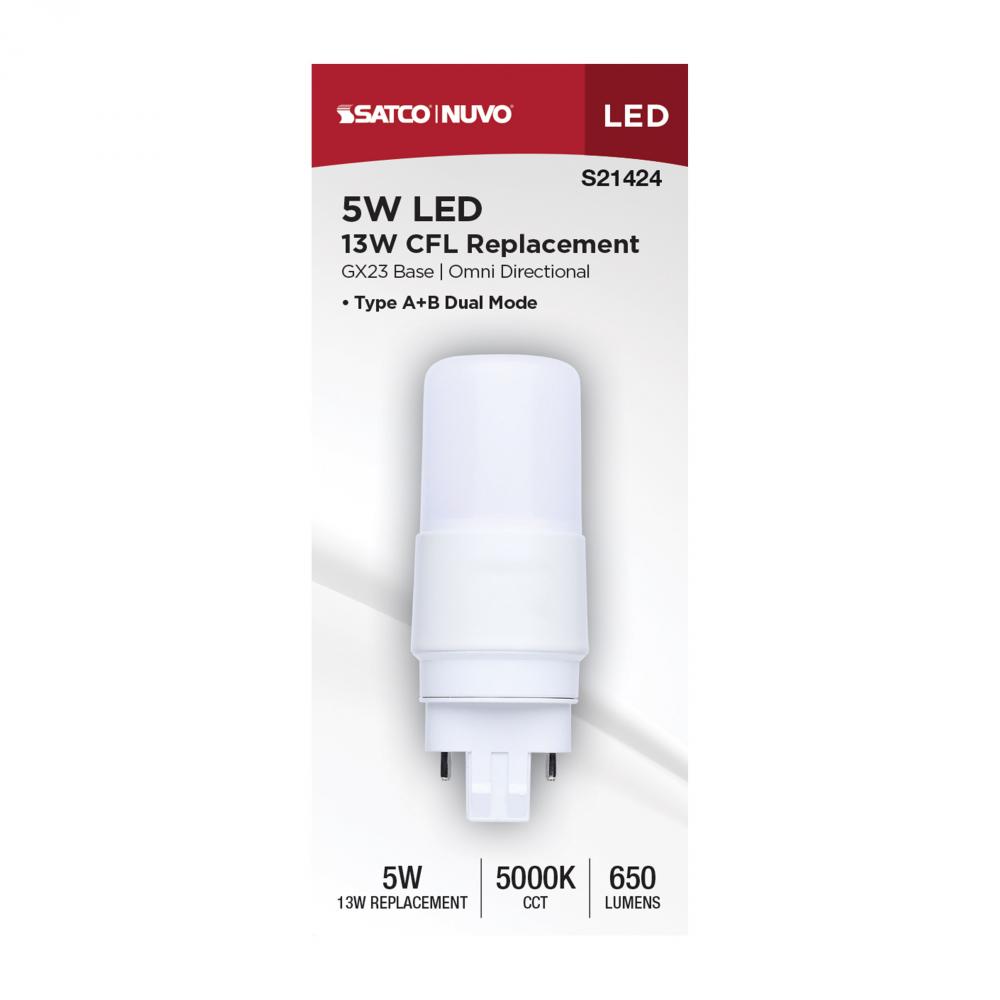 5 Watt; PL LED; GX23 Base; Frost Finish; Type A/B Dual Ballast; 5000K; 120-277 Range Voltage