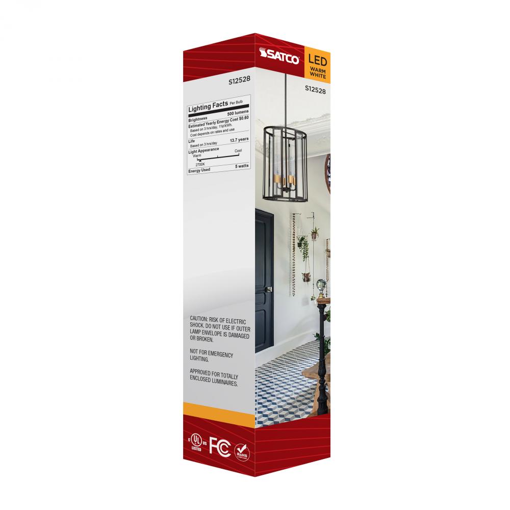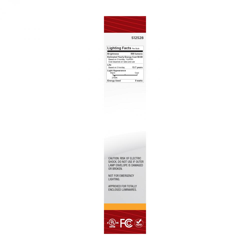 Satco's S12528 5-watt, LED lamp is traditional, yet contemporary with its vintage style and energy saving LED technology. Elegantly illuminate any room in the house with this dimmable, clear bulb. Sophisticated and modern, this lamp delivers 15,000 hou