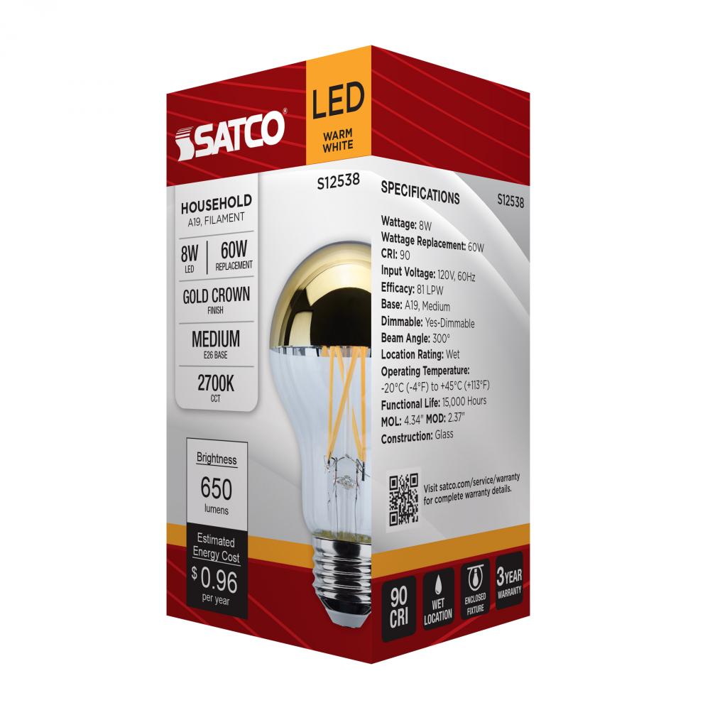 SATCO NUVO's S12538 Gold Crown LED lamp delivers vintage-inspired elegance with modern performance. This 8-watt A19 bulb features a striking half-bowl gold finish that redirects light back into the bulb, producing a soft, ambient glow while reducing ha