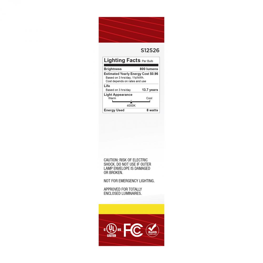 Satco's S12526 8-watt, LED lamp is traditional, yet contemporary with its vintage style and energy saving LED technology. Elegantly illuminate any room in the house with this dimmable, clear bulb. Sophisticated and modern, this lamp delivers 15,000 hou