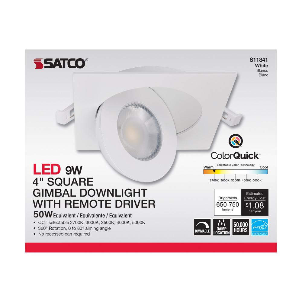 The white, four-inch square Satco S11841 gimbaled downlight delivers multiple advantages to any general recessed lighting project. Our ColorQuick technology allows the user to choose the color temperature from five different settings and brings the perfect