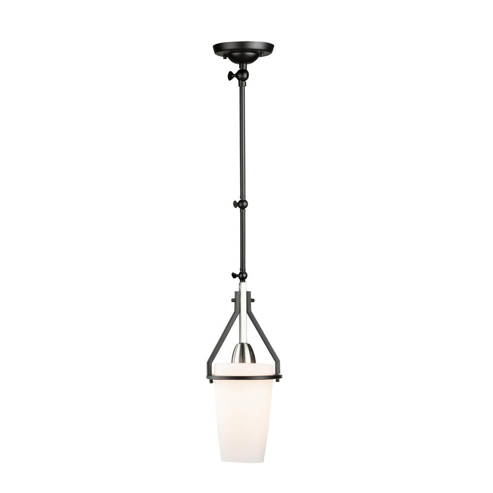 This model from the "Brydon Collection" features matte white tapered cylinder glassware. The metal work on this industrial looking fixture is black and nickel and has multiple hinges for adjustability. This model can be a wall bracket or straight rod pendant (extra 12" rod included for height if needed). If hanging as a wall sconce you can adjust the height and extension to your desired position.