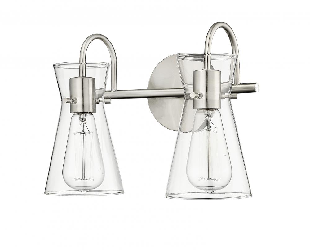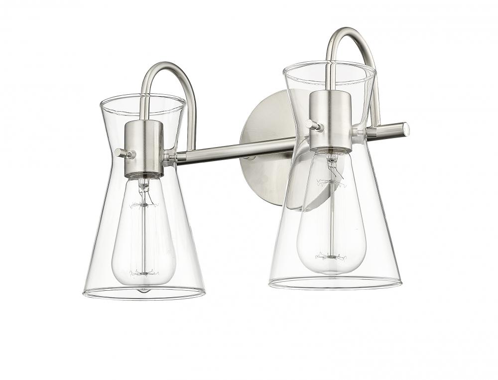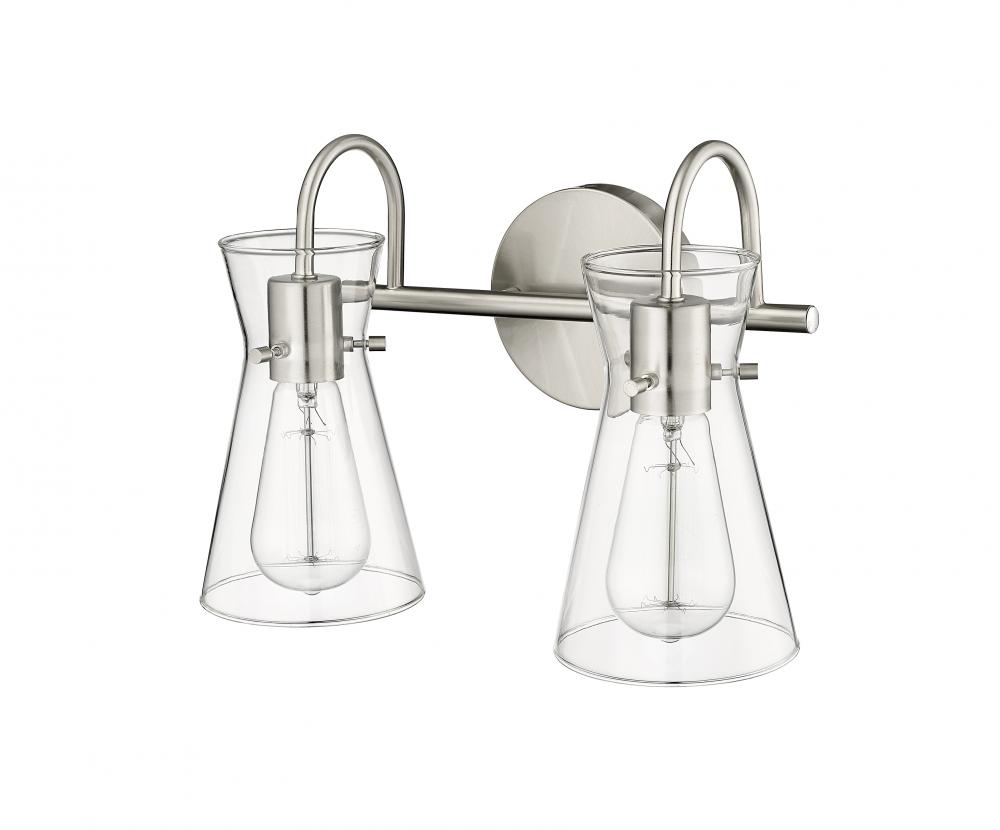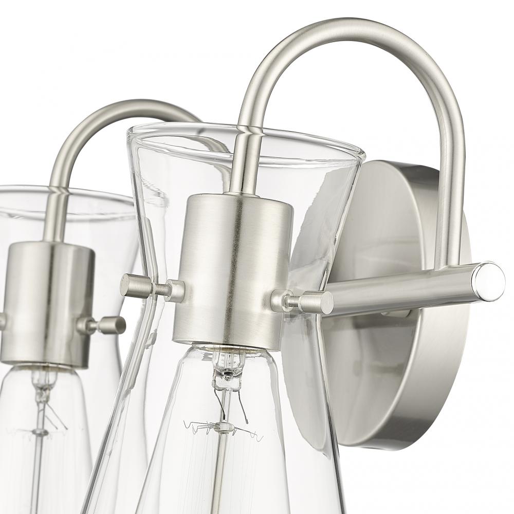 Distinctive beaker-shaped clear glass globes define the look of the Camellia Collection of vanity lighting. The overall design ensures well-defined lighting without shadows in the most needed spaces. The fixtures, featuring swan-neck lines and finished in modern gold, brushed nickel, or matte black, complete the overall design-forward effect and are available in 2-light, 3-light, and 4-light options.