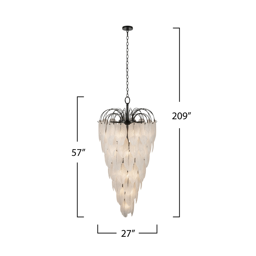 The Alessia Collection foyer chandelier is a captivating blend of modern elegance and nature-inspired artistry. Its bold black frame cradles cascading glass leaves, each etched with organic, lifelike details that evoke a serene forest canopy. With its enchanting glow, this chandelier helps transforms any foyer or staircase area. (57" in length)