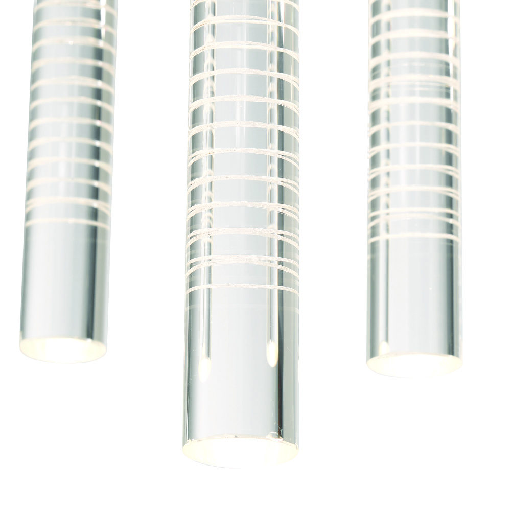 The Celine 7 light chandelier is a stunning masterpiece of modern elegance, featuring a black canopy and holders that exude warmth and sophistication. Its clear glass rods, adorned with intricate laser-etched lines, create a mesmerizing play of light and texture. Illuminated by LED technology, this chandelier offers a blend of energy efficiency and brilliance. With easily height-adjustable wires, it adapts seamlessly to any space, making it a breathtaking centerpiece for contemporary interiors. Great for an entry, foyer, or over a large dining room table.