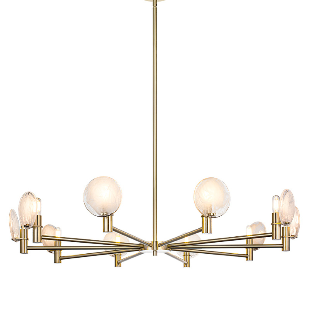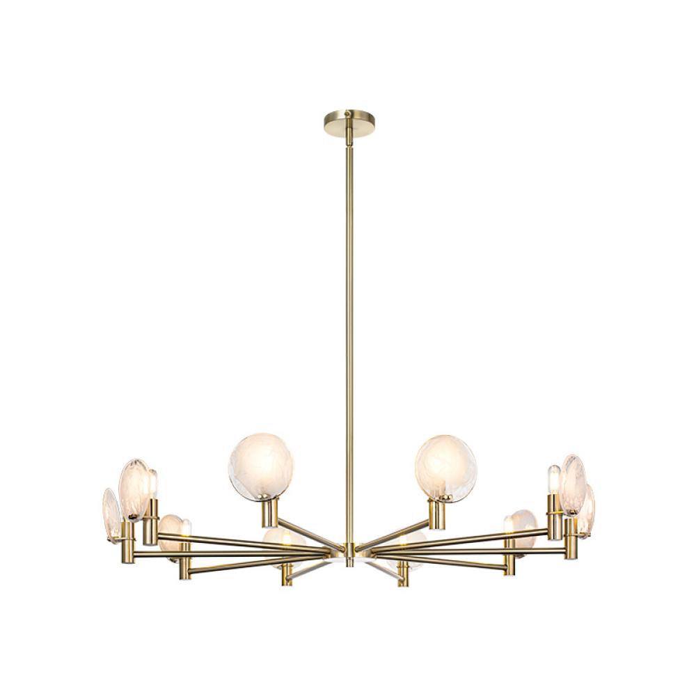 This chandelier blends mid-century modern with space-age sophistication ideal for upscale dining rooms, creative studios, or hospitality spaces aiming for an artistic edge.This can be shown with the light emitting up or down.The cloudy swirl glass gives it a soft touch to the design.