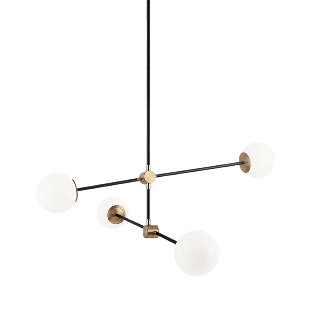 Cosmic is arranged with long, sleek, black rotatable rods, paired with Aged Gold Brass finish details. This collection is available in 3 sizes in either Clear or Opal glass to provide a stunning yet minimalistic look. The creativity of this series adds a unique detail to any space.