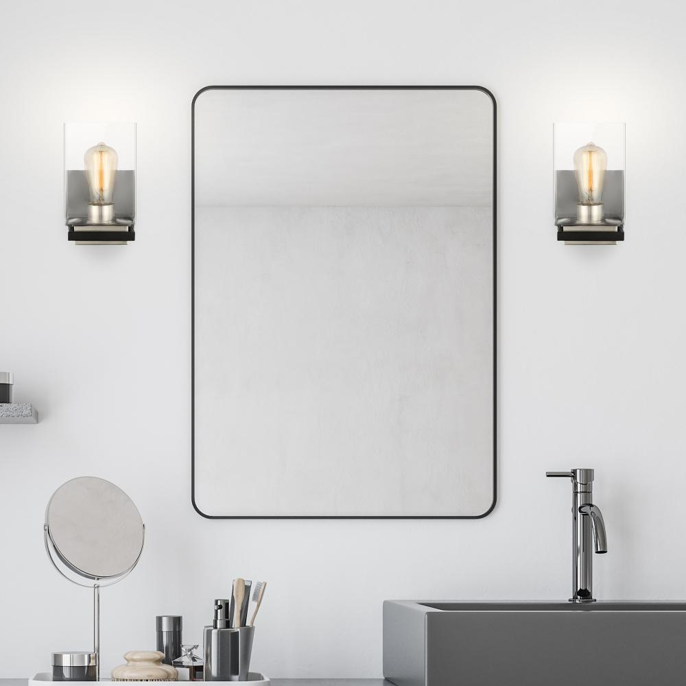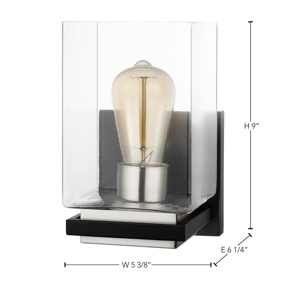 A combination of glass and metal comes together to create the stunning design of the Crossroad vanity light. The square, clear glass shades showcase the bulb. The socket and base are finished in brushed nickel to contrast beautifully with the matte black f