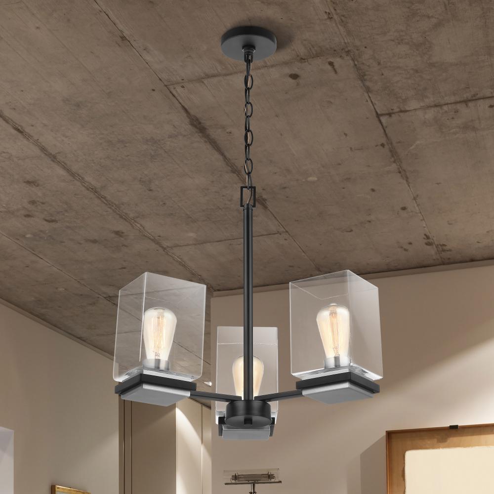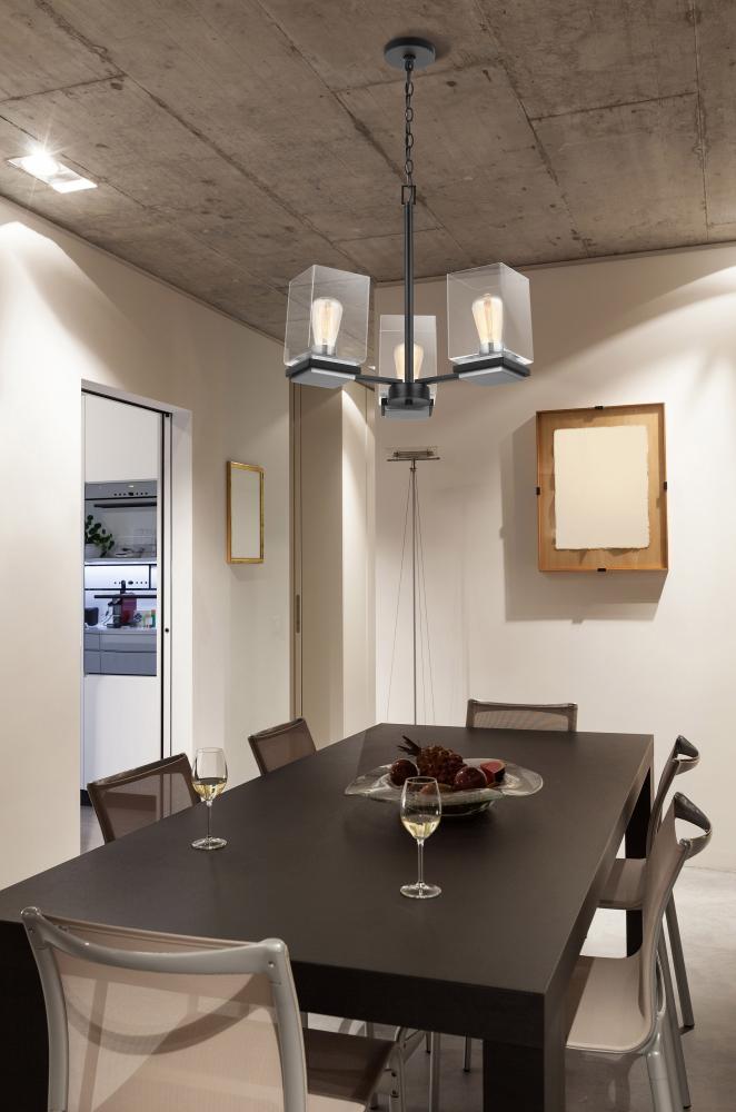 A combination of glass and metal comes together to create the stunning design of the Crossroad chandelier. The square, clear glass shades showcase the bulbs. The sockets and base are finished in brushed nickel to contrast beautifully with the matte black f