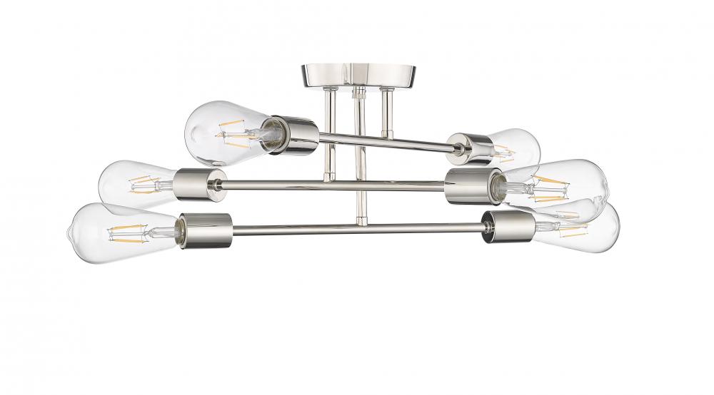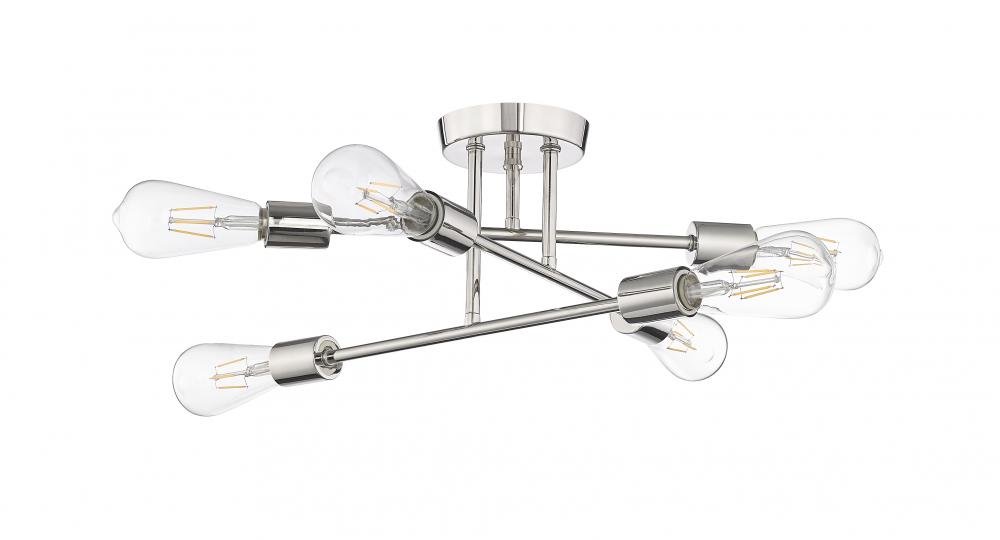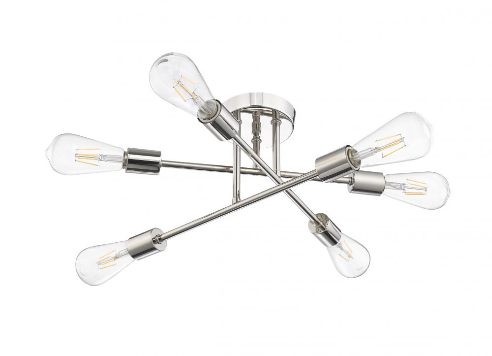 Much like the Art Deco design movement of the 1930s, The Decco Collection of today features a streamlined geometric design characterized by linear, stylized forms. The chandelier and semi-flush fixtures are finished in polished nickel or matte black and create a unique and dynamic look. Whether for a dining room or entryway, these pieces bring an artistic flair to any space.
