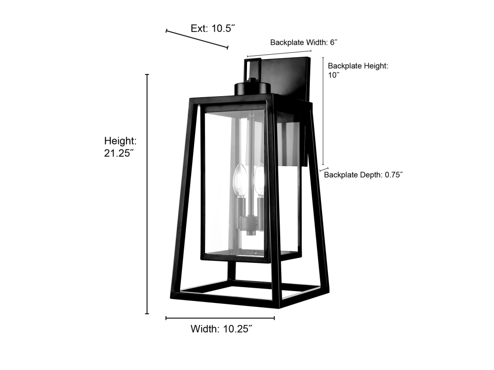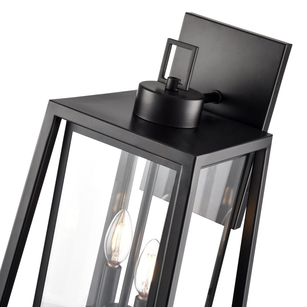 The Denzell Family of outdoor lighting gives the classic lantern profile a thoroughly modern makeover with its distinctive design. The tapered, outer framework perfectly silhouettes the clean lines of the lantern creating a unique dimensional lighting effect. Available as 1 or 2-light sconces and 1-light hanging lanterns, both with clear glass panels, the fixtures are finished in durable powder coat black and are perfect for the front porch, deck, and outdoor walkways.