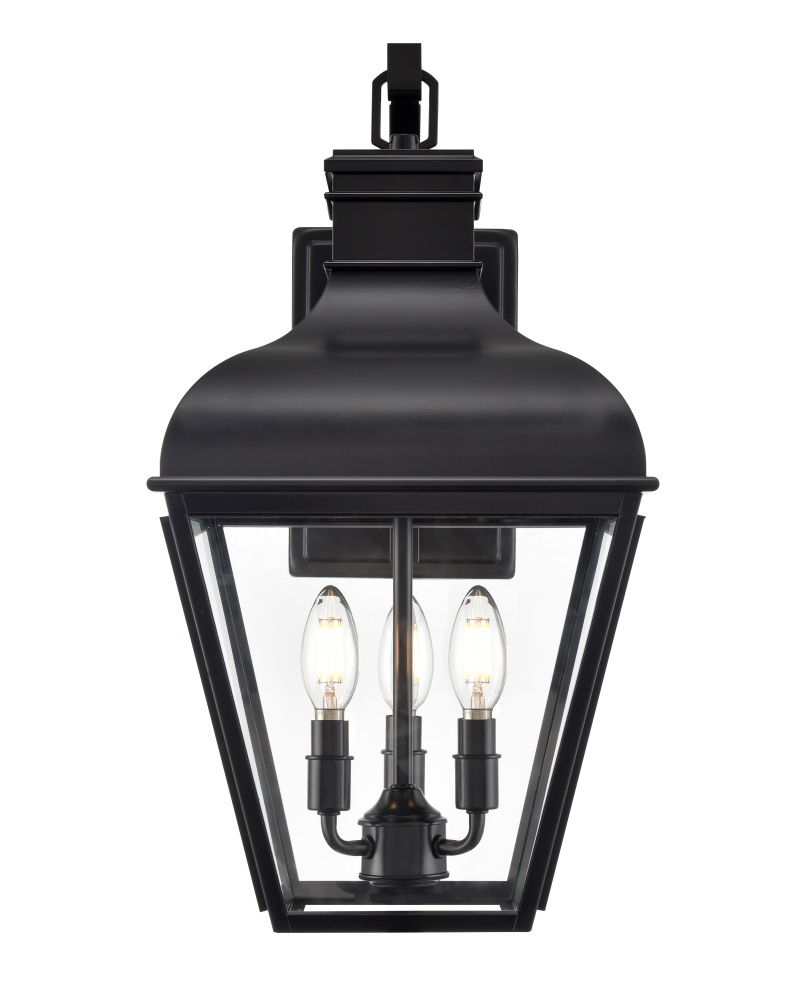 Elegant Edwardian-style gas lamps are reimagined with the Edenton Family of outdoor lighting. Available as 2-, 3-, and 4-light lanterns, the fixtures are finished in durable powder coat black and suspended on traditional barn-style joists cantilevering out from the wall for a look of architectural distinction. Whether flanking the entryway, or illuminating walkways or the deck, these refined fixtures make a tasteful design statement.