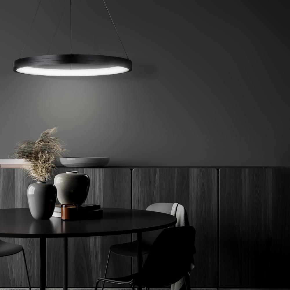 Introducing the EVINA LCH253A24BK, a sleek and modern LED chandelier that brings a touch of elegance and contemporary design to your home. This chandelier boasts a striking black finish and is crafted from white PVC, measuring 23.625 inches in width. It's equipped with an integrated 43W LED light, emitting a warm 3000K glow with an impressive 1700 lumens of brightness. The chandelier's dimmable feature allows you to create the perfect ambiance for any occasion. With an adjustable cable ranging from 6.75 inches to a substantial 63.75 inches in height, this fixture offers versatility for different ceiling heights and room sizes. Whether it's your living room, dining area, or a grand foyer, the EVINA chandelier is sure to add a touch of modern sophistication to your space.
