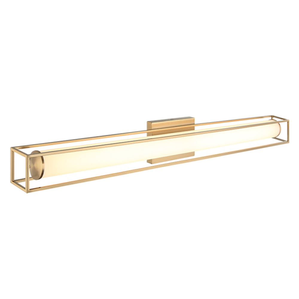 The Flannigan wall vanity series, available in 2 sizes. The LED cylinder tube is surrounded by a metal frame in Aged Gold Brass or Matte Black finish for a very striking polished look.