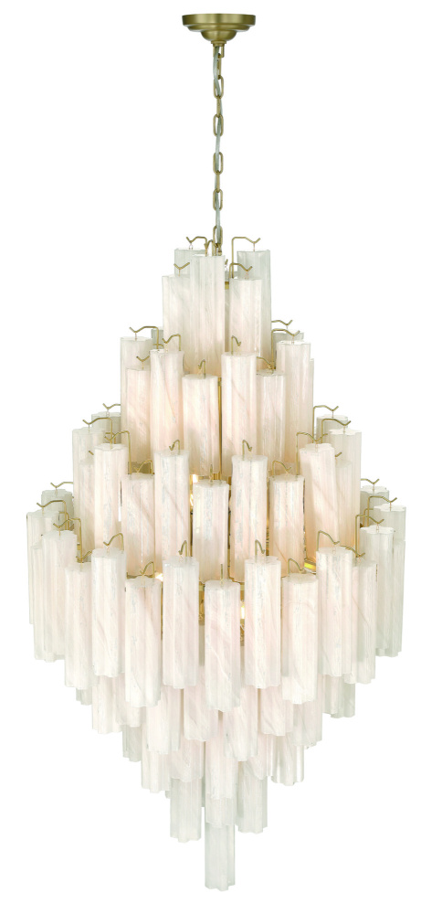 The foyer chandelier from the Sophia collection captivates with its cascading arrangement of ornate “Tronchi” style Wispy White glassware, reminiscent of shimmering icicles. Each glass element delicately refracts light, creating an enchanting glow, while the warm brass frame provides a refined contrast, evoking a sense of luxury. Perfect for classic and modern interiors alike, this design transforms any space into a haven of timeless beauty.