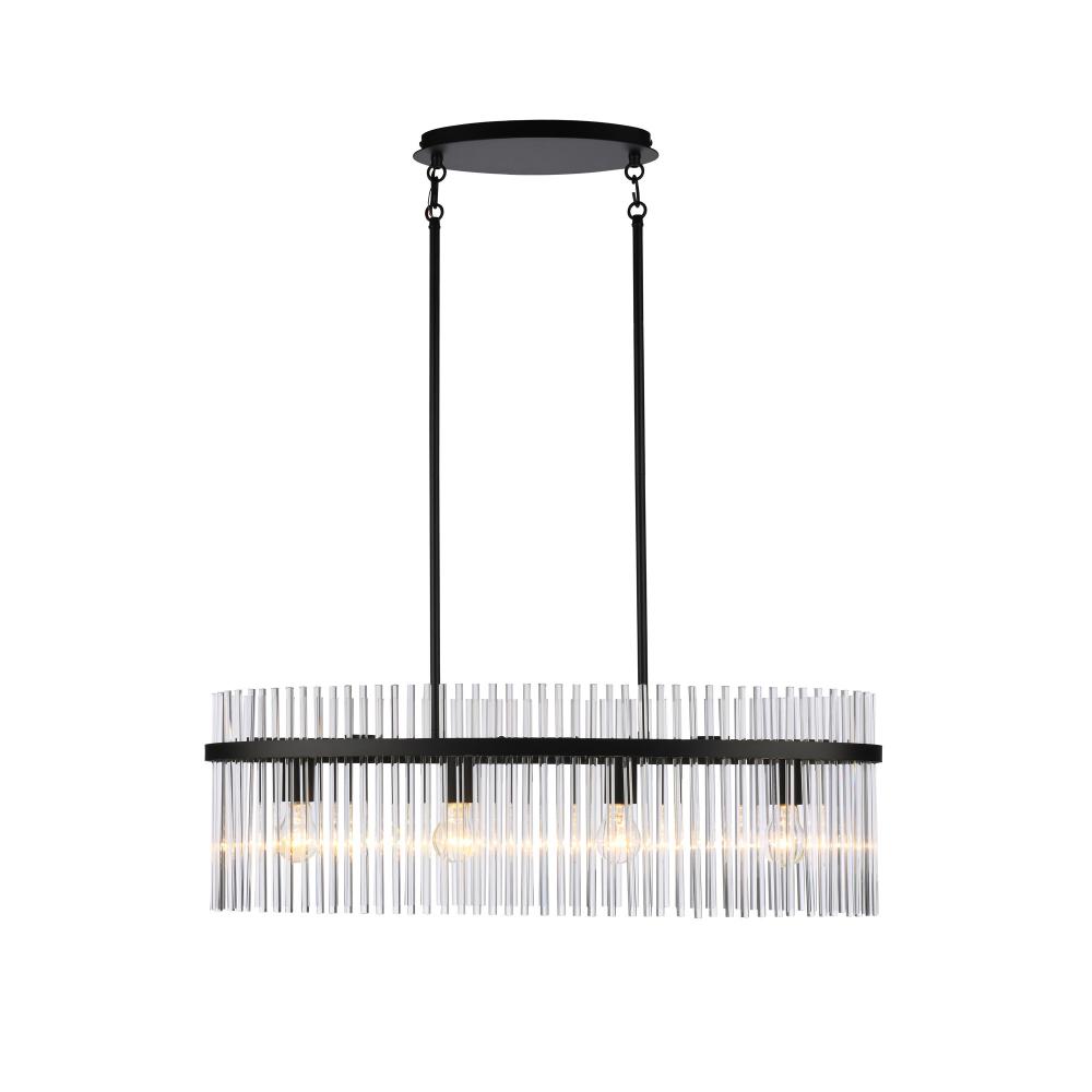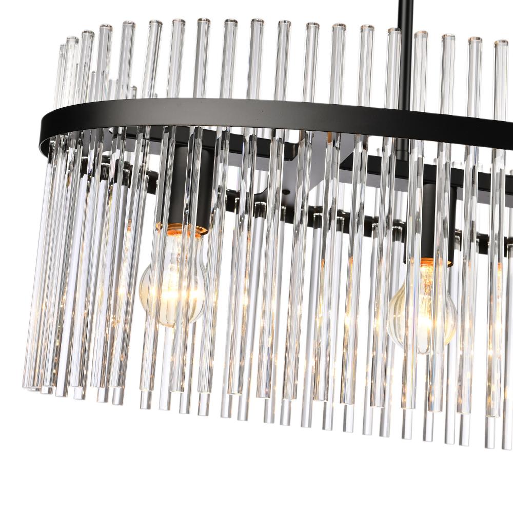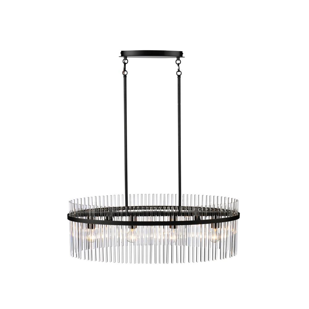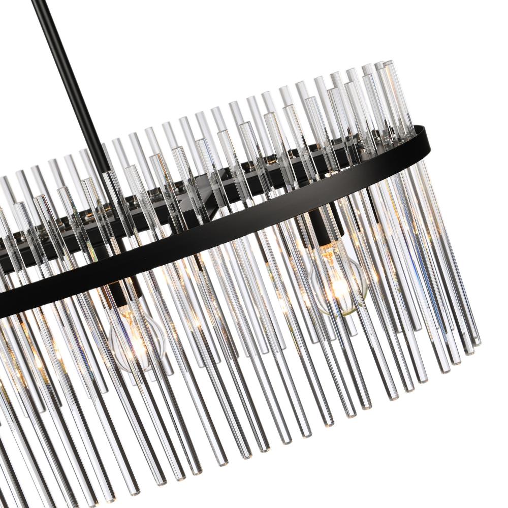 The Ava Collection oval chandelier enchants with its delicate arrangement of circular glass rods, elegantly suspended on a sleek black frame. Its versatile design harmonizes beautifully with both circular and rectangular tables, adding a touch of refined glamour to any room. (This model is easily height adjustable to meet you preference)