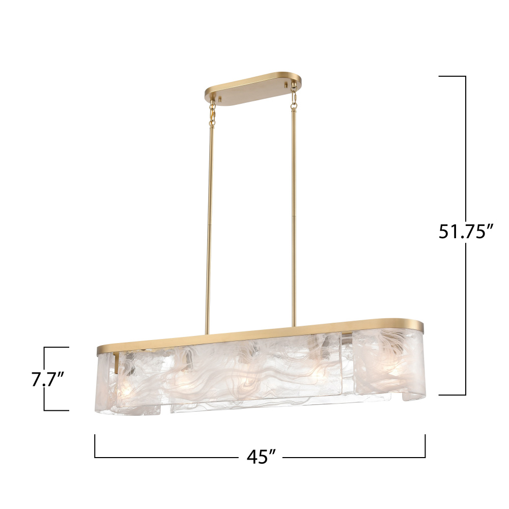 This stunning linear chandelier exudes timeless elegance, blending a brushed brass frame with the ethereal beauty of wispy white Murano-style glass panels. Its cylindrical silhouette radiates sophistication, creating a soft, ambient glow perfect for intimate spaces. The craftsmanship of the Skye collection by designer Kevin Kraemer is evident in the graceful harmony between its materials and design. This piece serves as both a functional light source and a work of art, elevating any room with its luxurious charm. (Comes with extra rods to be hung at the perfect height)