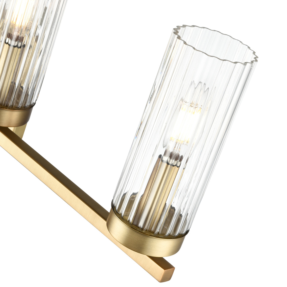 The Iversen Family of vanity and sconce lighting is distinguished by a blend of sleek lines accentuated with post-industrial style hardware. From the square backplate with inset design, to the sparkling clear reeded glass shades, the result is a dazzling play of light perfect for bath or hallway. These exceptional fixtures are available as 1-light sconces and 2-, 3-, or 4-light vanity lamps and are finished in brushed nickel, chrome, matte black, or vintage brass.