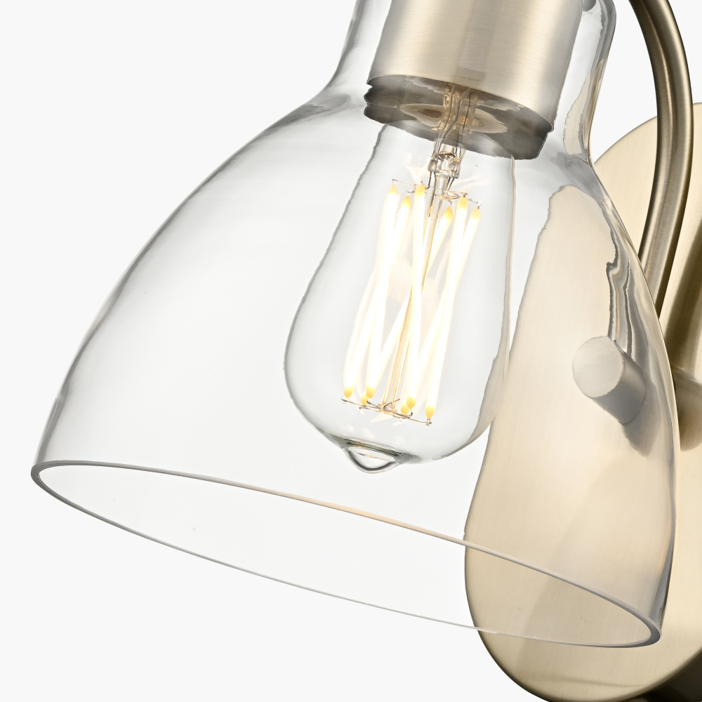 Refined simplicity is the hallmark of the Knightsdale Family of vanity lighting. Graceful bell-shaped clear glass shades set an elegant tone and provide a crisp clear lighting effect perfect for any bath. The minimalistic hardware strikes the perfect balance with the shades and is finished in matte black, chrome, or modern gold. Available as 1, 2 and 3-light options, these fixtures create a sleek and understated profile.