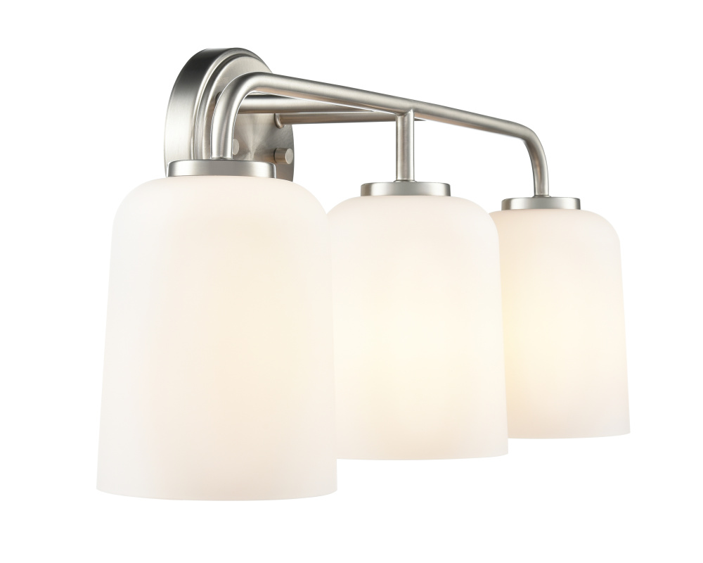 The Laphia Family features sleek lines, a graceful profile, and brilliant white, bell-shaped glass shades creating an ambient glow. The Family is available as sconce, chandelier, pendant, mini-pendant, semi-flush mount, flush mount, and an excellent vanity task light. Perfect for any interior plan from Craftsmen to modern farmhouse, these fixtures are finished in stylish brushed nickel, matte black, or modern gold.