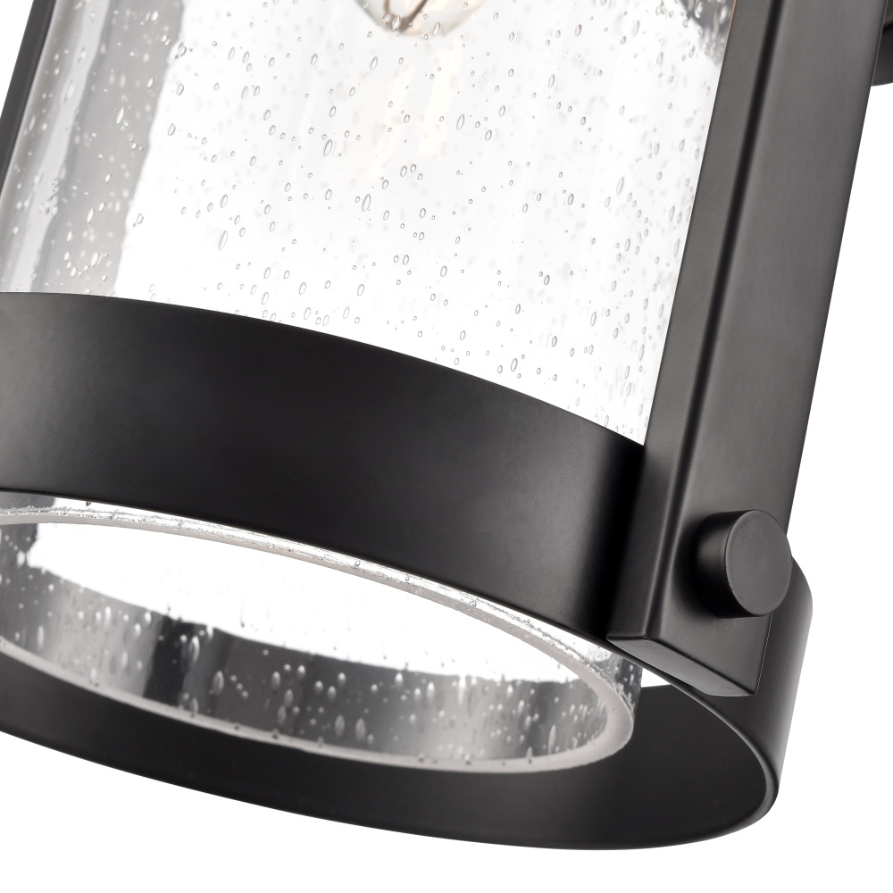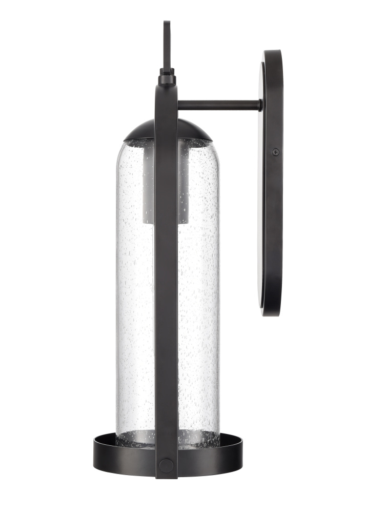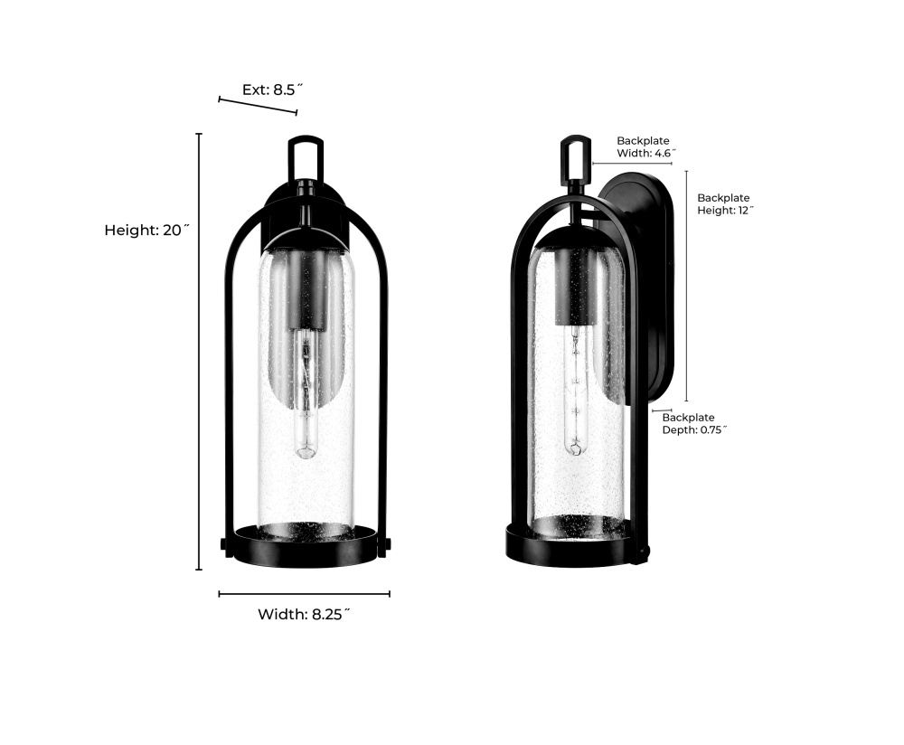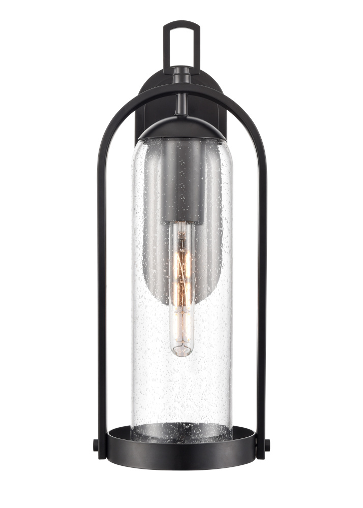 The Luxio Family of outdoor lighting is a fashionable take on the classic lantern profile. The birdcage-inspired metalwork is enhanced with modern styling and creates the perfect framing for the elongated clear-seeded glass shade. Available as 1-light sconce or 1-light hanging lantern and finished in powder coat black, these dynamic fixtures invoke the perfect look for any exterior, from ultra-modern to Mission Revival.