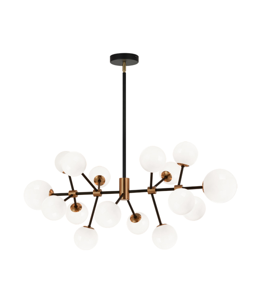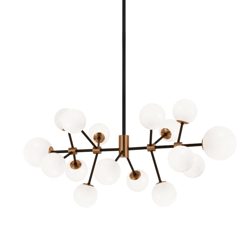 A retro inspired collection that will integrate seamlessly with many decors. Novu comes in Opal glass on sleek black rods offset with Aged Gold Brass accents. Available in a complete family including various sized ceiling fixtures, a wall sconce and a flush mount.