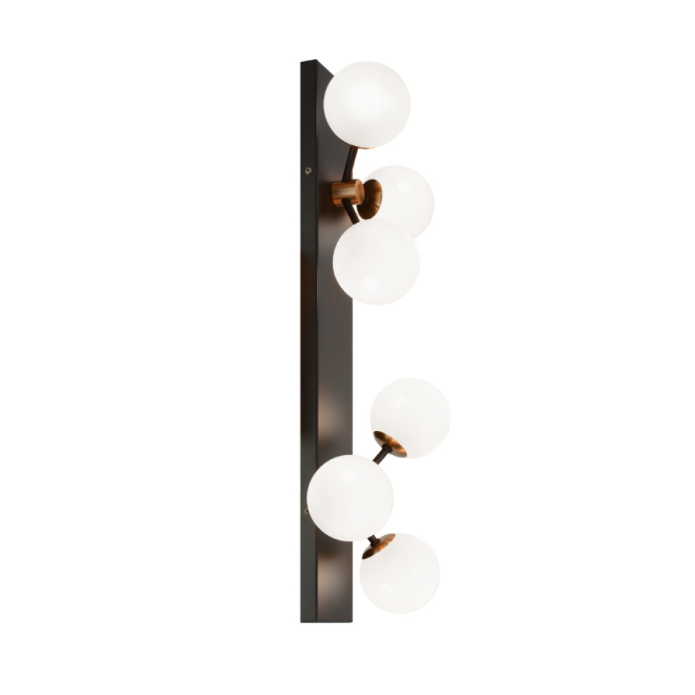 A retro inspired collection that will integrate seamlessly with many decors. Novu comes in Opal glass on sleek black rods offset with Aged Gold Brass accents. Available in a complete family including various sized ceiling fixtures, a wall sconce and a flush mount.