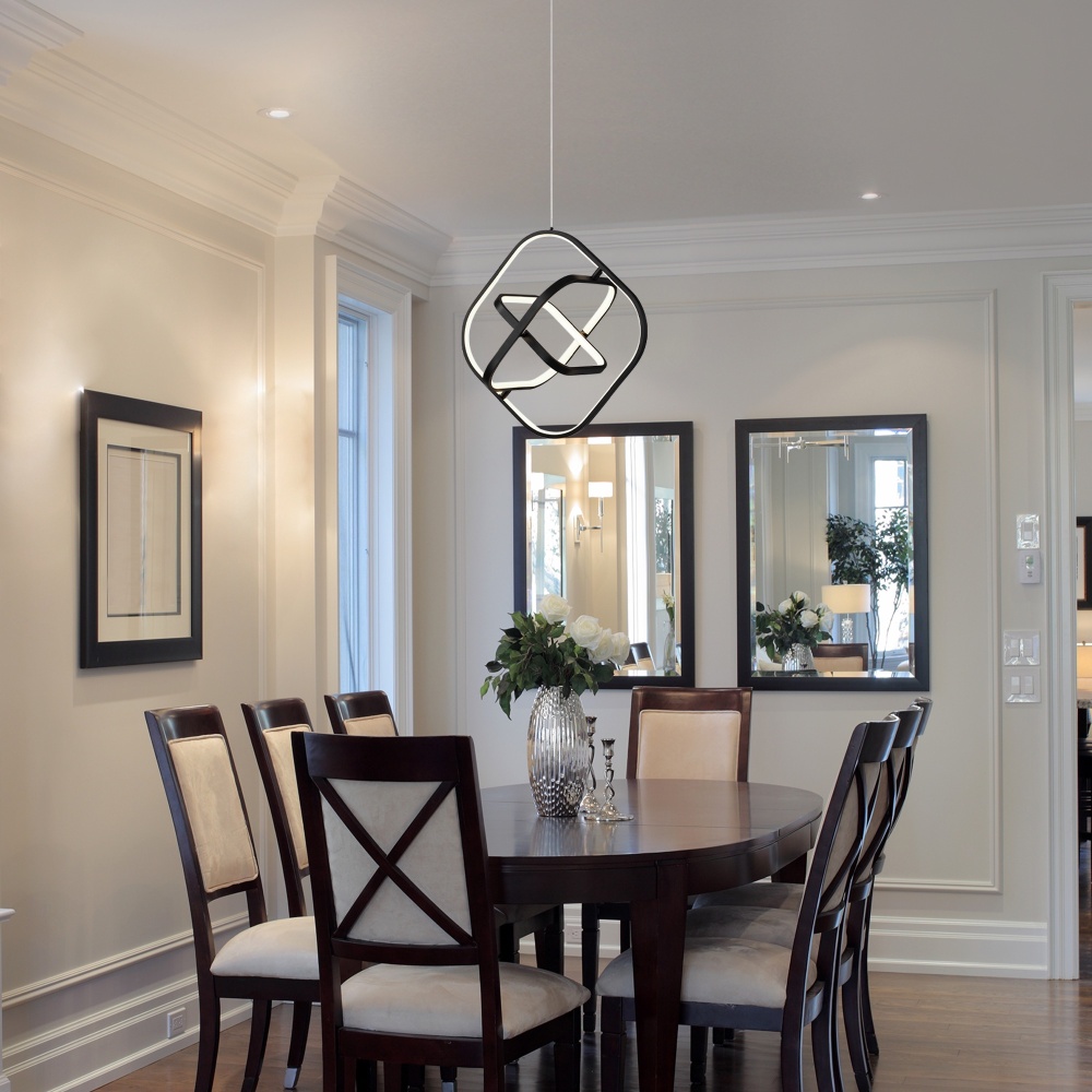 The Sienna Collection LED chandelier has a unique square shape with circular edges. (The interior can be rotated to any desired position). This collection is finished is a rich semi gloss black. Has a pushpin system on canopy for easy height adjustment.