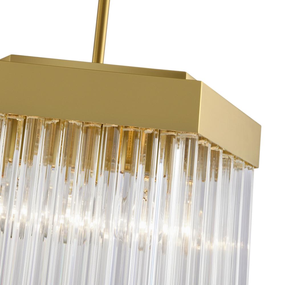 The large pendant from the Emma collection by designer Kevin Kraemer is a captivating blend of elegance and geometry. Individual glass rods, delicately suspended from a brushed brass hexagonal frame, shimmer with timeless sophistication, creating a mesmerizing interplay of light. Complemented by a matching hexagonal canopy, this design brings an air of modern luxury to any space. (this model can be used as a pendant or as a close to ceiling semi-flushmount)
