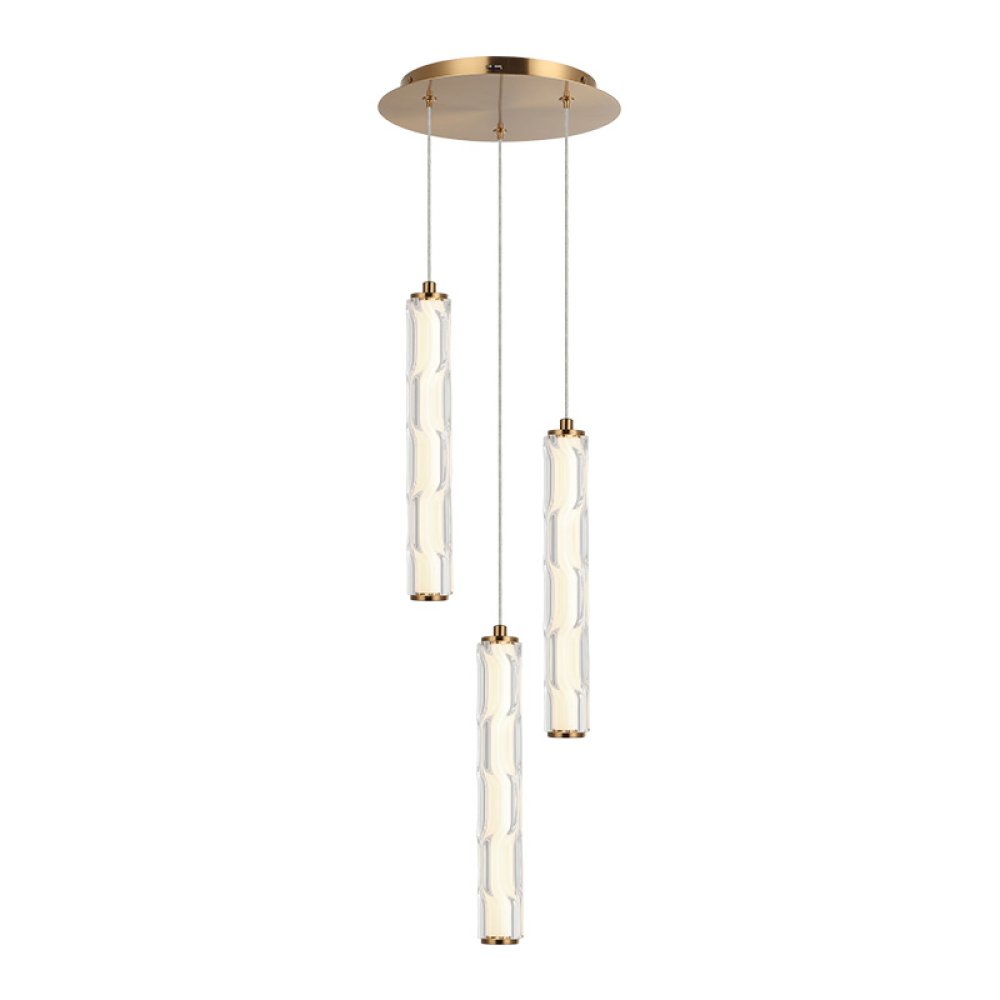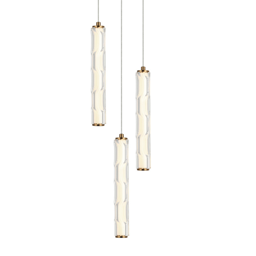 This family features a sleek, modern design with a vertically oriented, elongated cylindrical glass shade that has a wavy, textured surface. The inner 5CCT LED light diffuses through the contoured glass, giving off a soft glow that plays beautifully with the curves adding visual interest and depth. Comes in Aged Gold Brass and Matte Black.