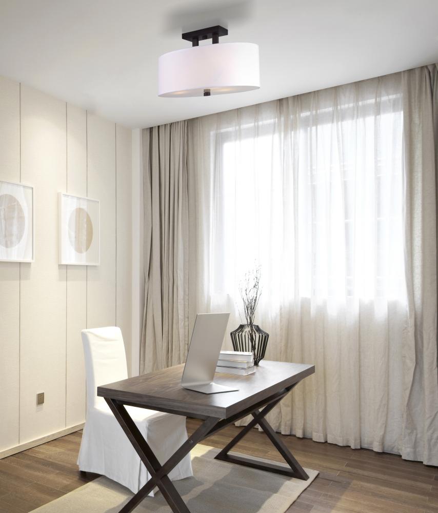 River 3 Light Semi Flush, Bronze Finish - Experience the warmth and sophistication of the River 3 Light Semi Flush Mount. This fixture features a white fabric shade and a glass diffuser, all in an Oil Rubbed Bronze finish. It’s perfect for adding a touch of elegance to living rooms, dining areas, or bedrooms.