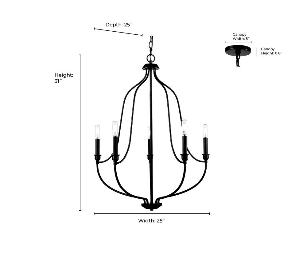 The Senoia Collection of chandeliers is a delightful interpretation of wrought iron inspired French country lighting design. Accentuated with draping lines evocative of delicate scrollwork and perfectly placed candles with cups, the collection is finished in matte black or modern gold and is available as 5-light or 9-light options. The result is a light, airy profile perfect for any interior. from modern transition to classic farmhouse.