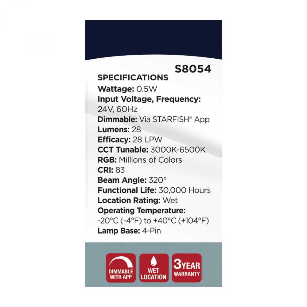 Illuminate your space with the Starfish S8054, 0.5 Watt LED Replacement Lamps for SATCO's STARFISH Smart LED String Lights S11190 and S11191. Featuring a 4-pin base, these dimmable with Starfish App bulbs offer vibrant RGB and tunable white options. Wi