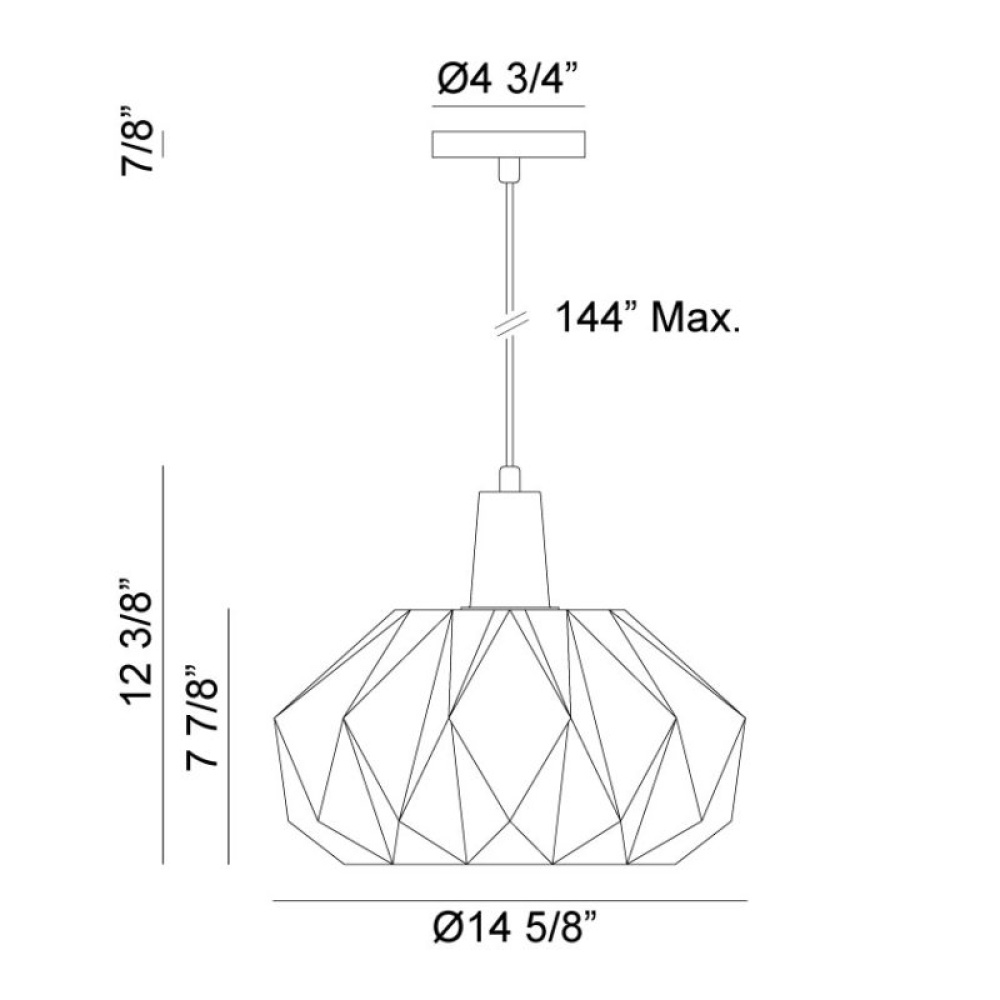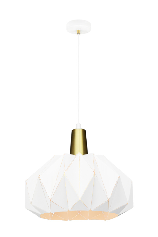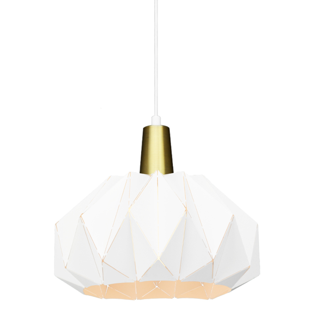 The body design resembles the Japanese traditional paper craft, origami. The lampshade itself consists of 2-dimensional geometric shapes folded together like a fan. The geometric shape used includes a number of different triangles, which creates a look of a 3D visual effect. This fixture is available in two sizes and comes with Brushed Gold accents, a white fabric cord and a white canopy.