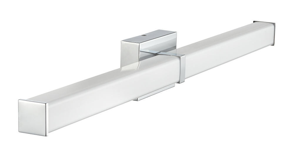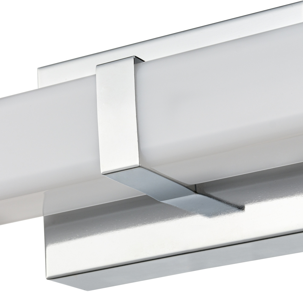 This fixture features a chrome finish and white acrylic shade.