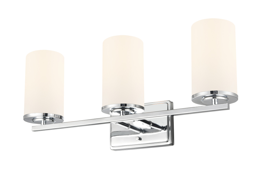 This fixture features a chrome finish and etched white glass shade.
