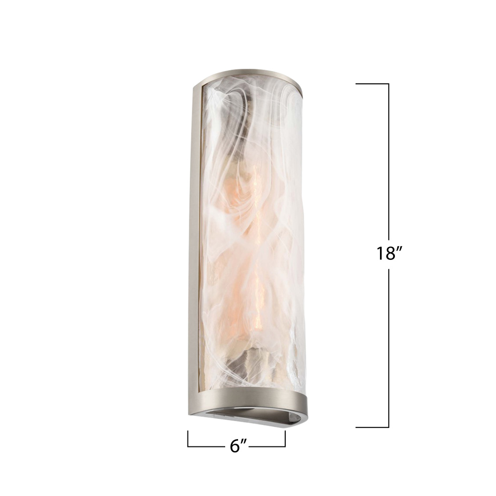 This stunning wall scone exudes timeless elegance, blending a brushed nickel frame with the ethereal beauty of wispy white Murano-style glass panels. Its cylindrical silhouette radiates sophistication, creating a soft, ambient glow perfect for intimate spaces. The craftsmanship of the Skye collection by designer Kevin Kraemer is evident in the graceful harmony between its materials and design. This piece serves as both a functional light source and a work of art, elevating any room with its luxurious charm.