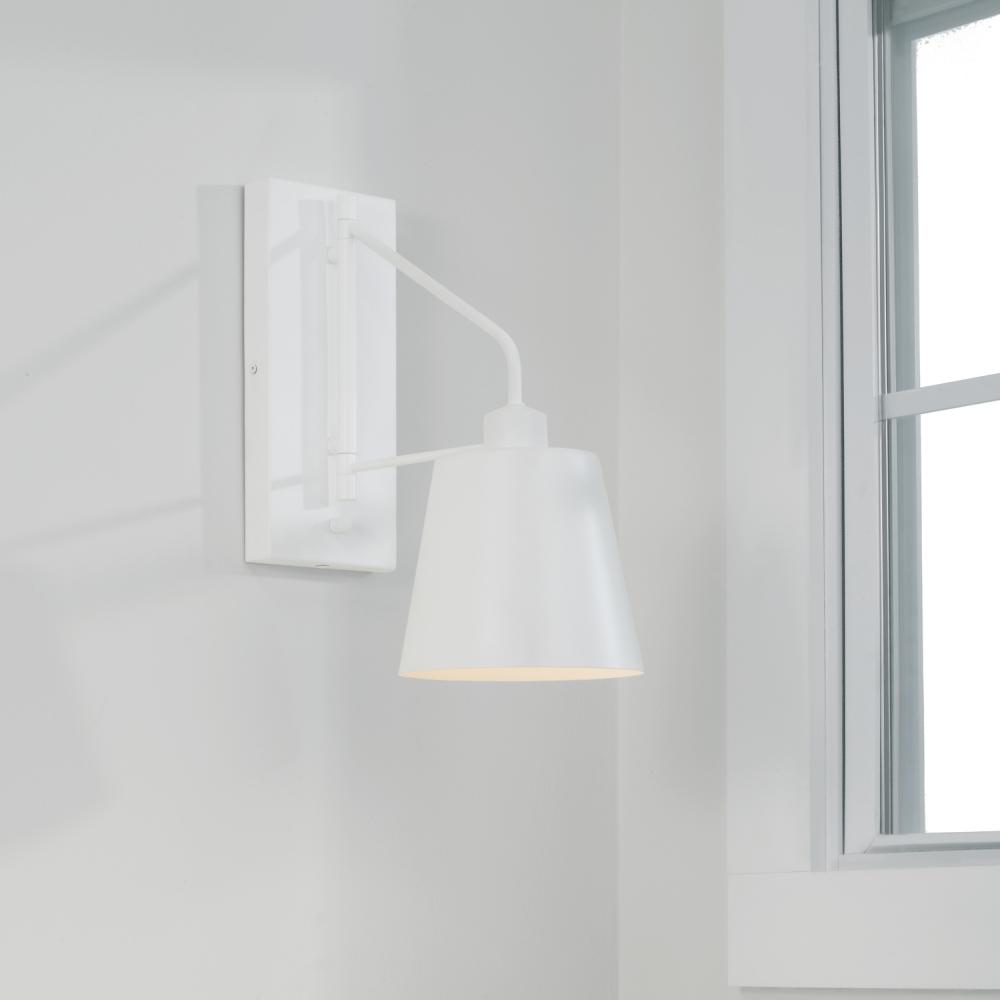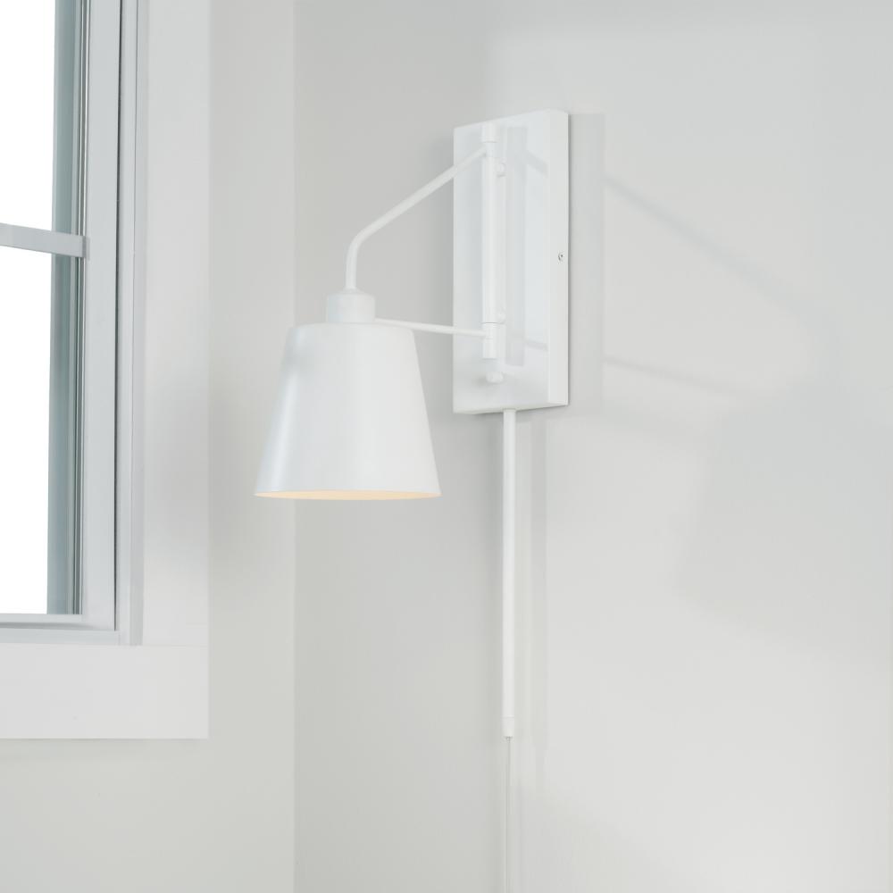 Spotlight distinct style with the Alden Sconce. The White finish offers a sleek contrast, and the crisp, tapered metal shade swings from side to side and includes a dimmer switch bringing modern task lighting where you need it most. This versatile fixture includes a 12 cord cover and plug-in option.